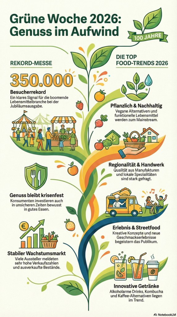 Die Grüne Woche 2026 in Berlin erreichte mit rund 350.000 Besucherinnen und Besuchern eine Rekordmarke. Trotz wirtschaftlicher Unsicherheiten zeigt die Messe, dass Essen und Getränke ein stabiler Wachstumsmarkt bleiben. Zentrale Trends sind pflanzliche Produkte, regionale Qualität, Streetfood, fermentierte Getränke, alkoholarme Drinks und innovative Genuss Konzepte.