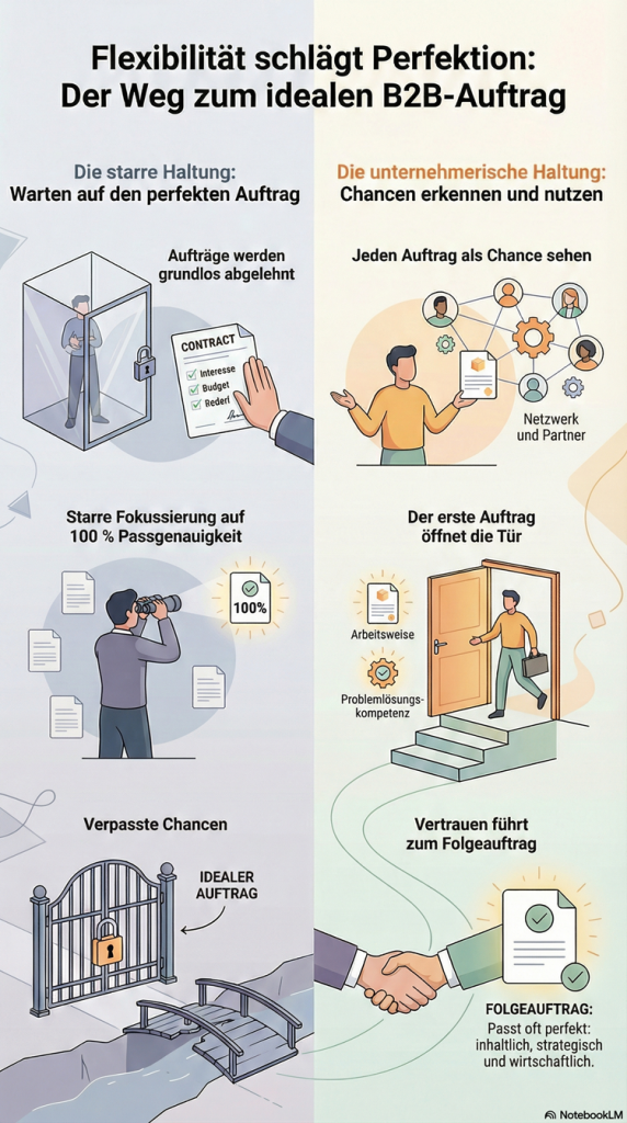 Der erste Auftrag muss nicht perfekt sein, um langfristig perfekt zu werden. Flexibilität öffnet Türen. Starrheit schließt sie.